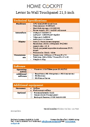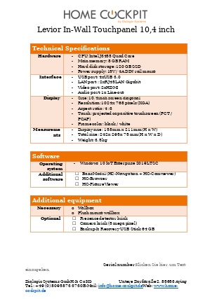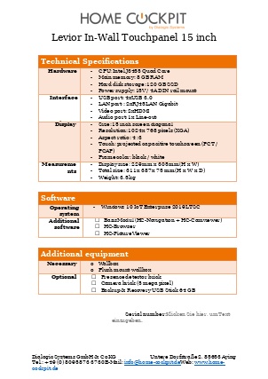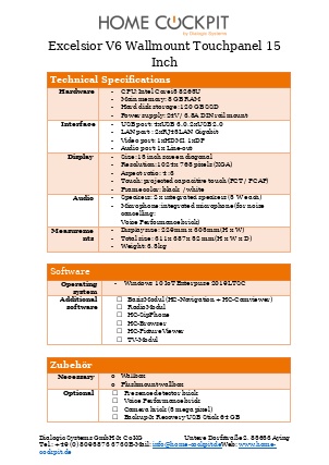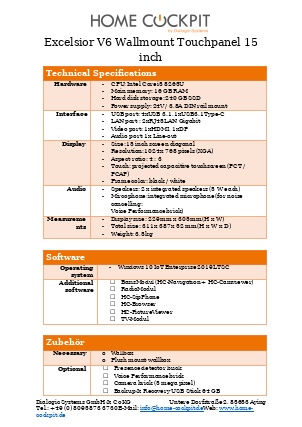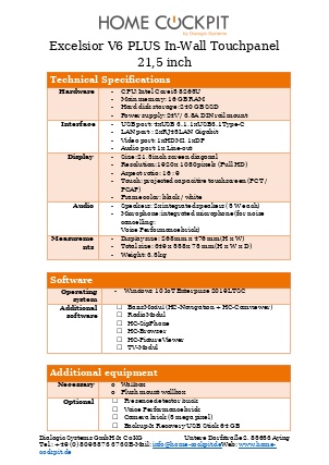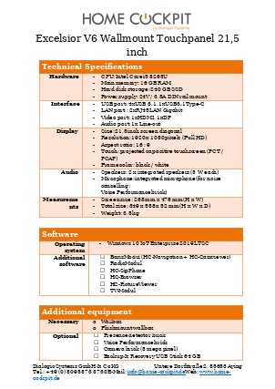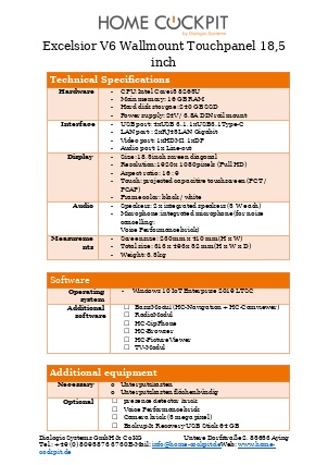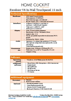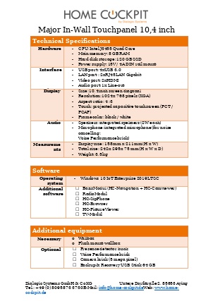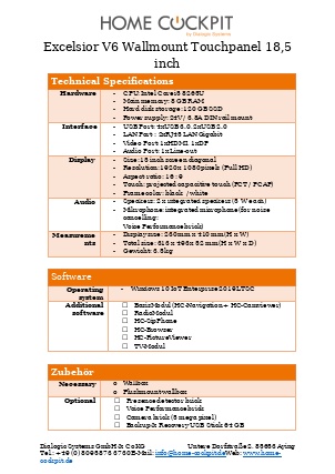 | Measurements HomeCockpit 104 (10,4") HomeCockpit 150 (15,0") HomeCockpit 185 (18,5") HomeCockpit 215 (21,5") | W x H 295 x 242 mm 387 x 311 mm 493 x 313 mm 558 x 349 mm | |||