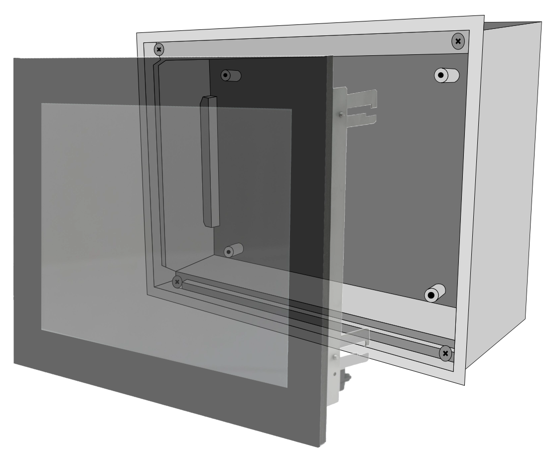 In-Wall Mounting is the perfect way to integrate your' HomeCockpit Touchpanel into walls invisibly. Therefore you first need to mount our Wallbox in the desired spot of the wall and route wiring for electricity and network to said Wallbox. The touchpanel is held in place by four mounting rails and can be removed with a few moves.