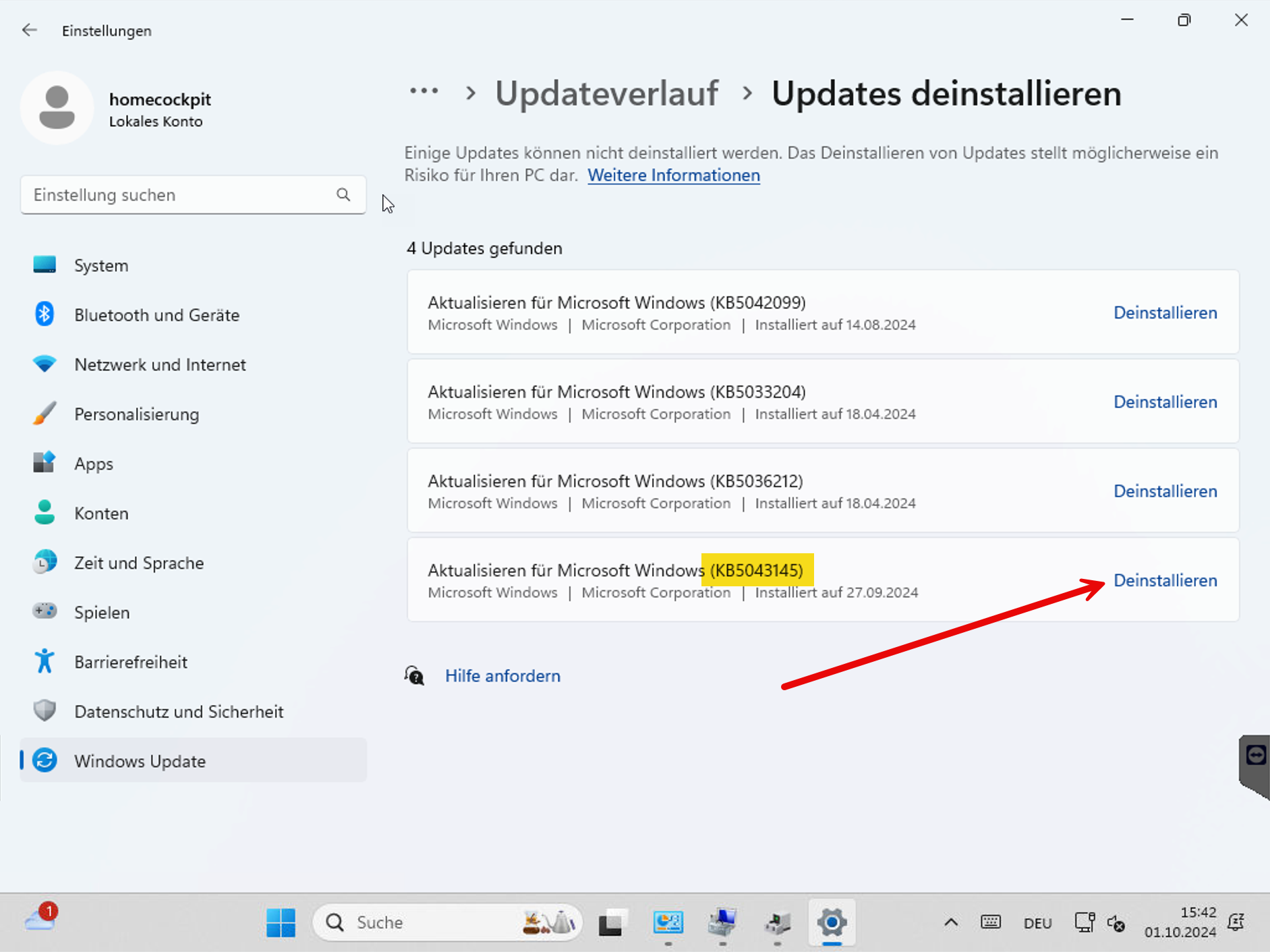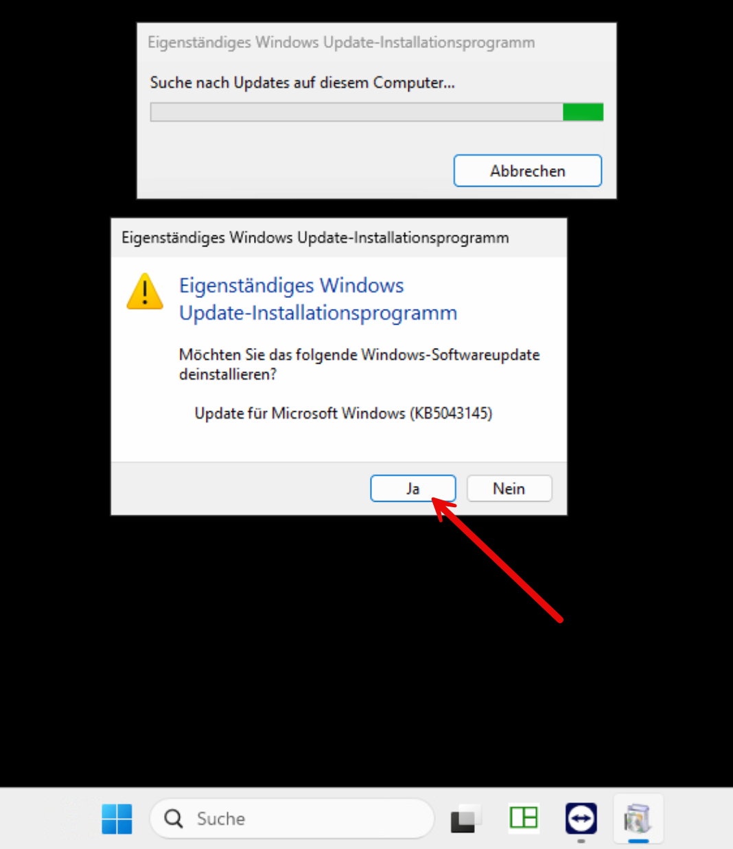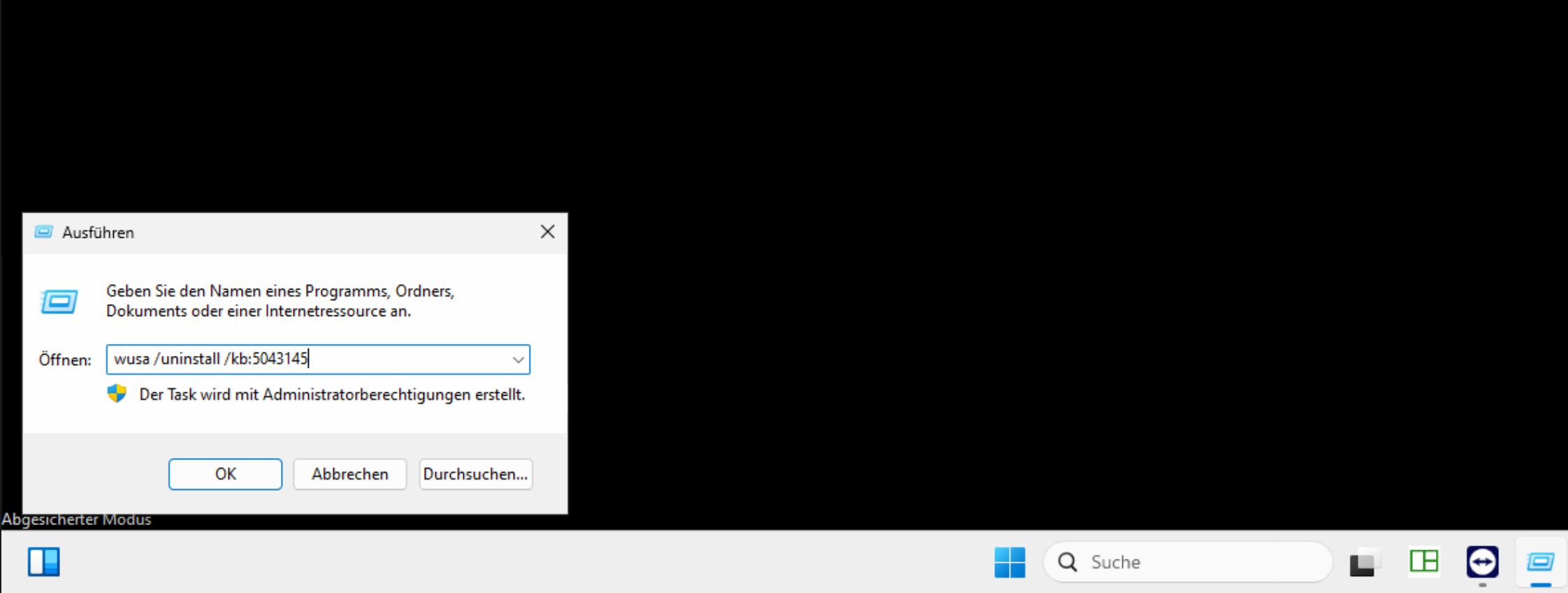wusa /uninstall /kb:5043145 in Ausführen schreiben und mit Enter bestätigen.