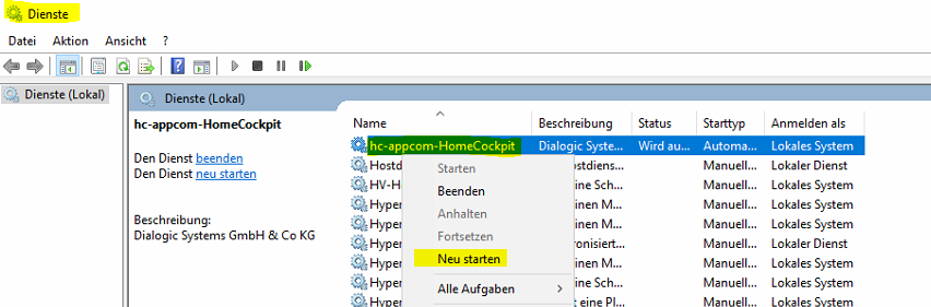 Nach einer Konfigurationsänderung muss der Serice neu gestartet werden: